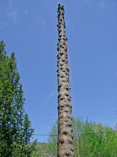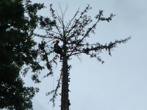 Quand il faut abattre un arbre, dans des endroits exigus, nous pratiquons l’abattage par démontage. C’est souvent le cas en zone urbaine, à côté des écoles ou des habitations ou aux bord des routes. L’arboriste-grimpeur déshabille l’arbre de ses branches et des ses feuilles avant de le démonter morceaux par morceaux. Il peut s’effectuer avec ou sans rétention des charges (billons et branches) en fonction de l’environnement (toitures, garages ou aménagements paysagers).